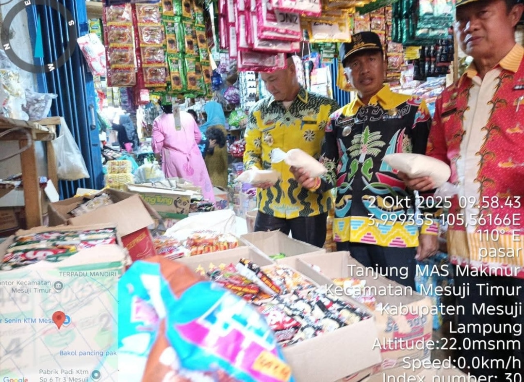DETEKSI.co-LAMPUNG, Camat Mesuji Timur, Roly Aditiawan Jaya, S.E.,M.M., bersama Tim Pemerintah Kabupaten(Pemkab) Mesuji Lampung melakukan pengecekan Gula Kristal Rafinasi(GKR) di Pasar Senin Kota Terpadu Mandiri(KTM).