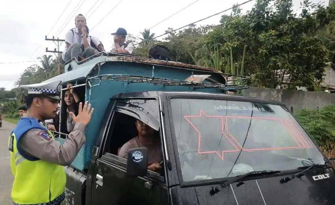 “Petugas patroli Sat Lantas Polres Nisel langsung memberhentikan mobil tersebut dan menurunkan penumpang anak-anak sekolah yang berada diatas kap mobil maupun yang bergantungan”, tutur Agus.