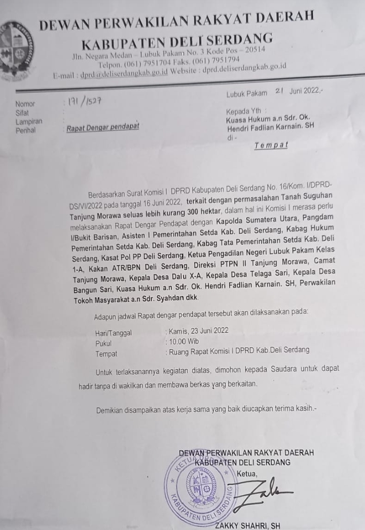 Berdasarkan Surat Komisi I DPRD Kabupaten Deli Serdang No.16/com l/DPRD-DS/Vl/2022 pada tanggal 16 Juni 2022, terkait dengan permasalahan Tanah Suguhan Tanjung Morawa seluas lebih kurang 300 Hektar, dalam hal ini Komisi l merasa perlu melaksanakan Rapat Dengar Pendapat dengan Kapolda Sumatera Utara,Pangdam l/Bukit Barisan,