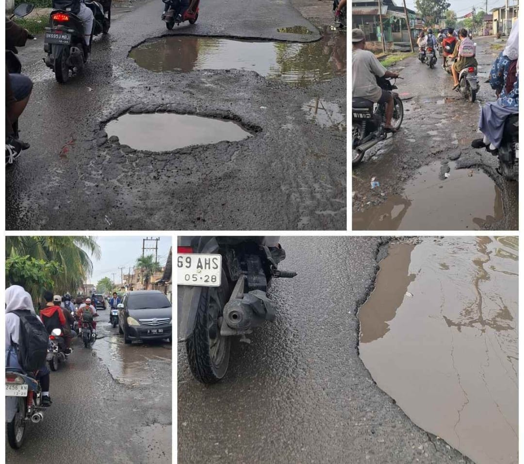 Dalam pantauan di lapangan, jalan tersebut dipenuhi lubang-lubang besar yang terisi air hujan, menciptakan genangan yang berbahaya bagi pengendara, khususnya sepeda motor.