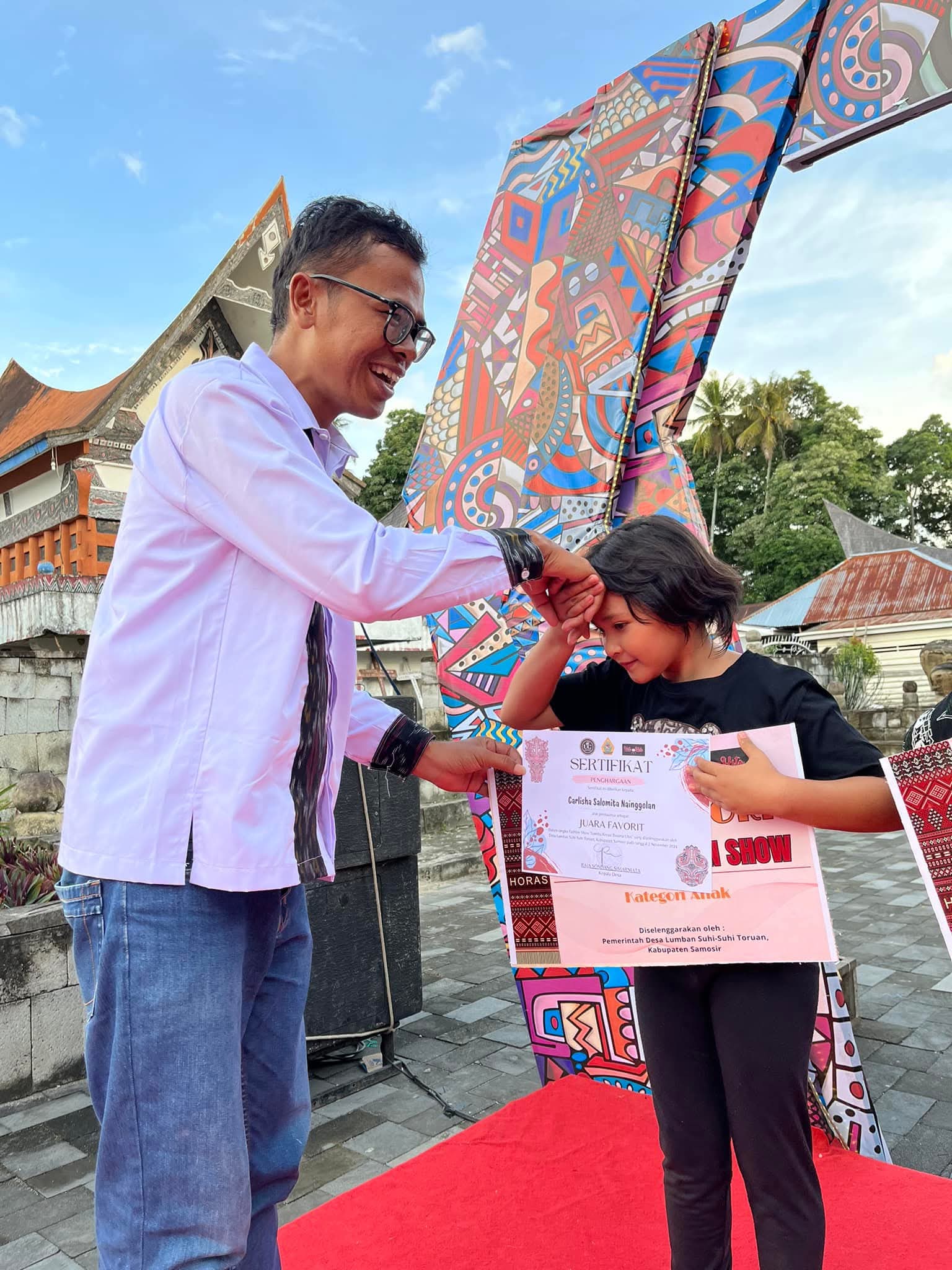 Ketua APDESI Kabupaten Samosir, Raja Simarmata, saat menyerahkan hadiah perlombaan di Desa Lumban Suhi Toruan. (DETEKSI.co/ Facebook Raja Simarmata)