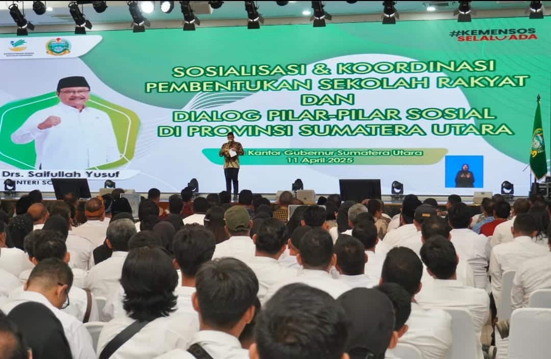 DETEKSI.co-Medan, Wali Kota Medan Rico Tri Putra Bayu Waas menghadiri Sosialisasi dan Koordinasi Pembentukan Sekolah Rakyat (SR) dan Dialog Pilar-pilar Sosial di Provinsi Sumatera Utara, bersama Menteri Sosial Republik Indonesia Saifullah Yusuf di Aula Raja Inal Siregar Kantor Gubernur Sumut, Jalan Diponegoro Medan, Jumat (11/4/2025).
