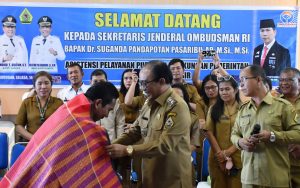 Usai penyampaian materi dan sesi diskusi, Wabup Ariston memberikan cendera mata berupa plakat dan ulos kepada Sekretaris Jenderal Ombudsman RI.(hot).