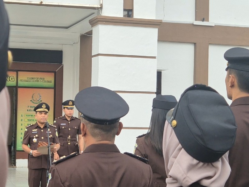 Hari pertama menjabat Plt Kajari Madina, Yos Arnold Tarigan membacakan pesan dan amanat Jaksa Agung RI ST Burhanuddin dan program Asta Cita Presiden Prabowo Subianto.