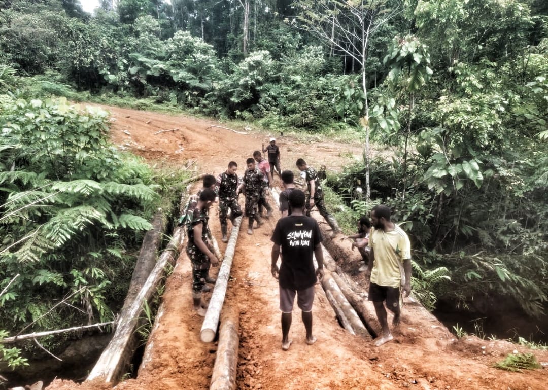 DETEKSI.co-Boven Digoel, Papua – Personel Satgas Pamtas Yonif 126/Kala Cakti Pos Wametkapa menunjukkan komitmennya dalam membantu masyarakat dengan melaksanakan kegiatan gotong royong perbaikan jembatan menuju Kampung Wametkapa, Distrik Waropko, Kabupaten Boven Digoel, Papua, Selasa (24/6/2025).