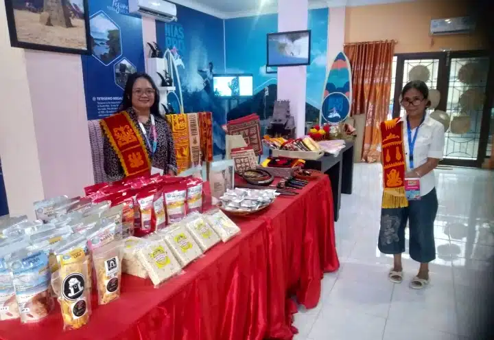 Menurut Jeni berbagai produk UMKM kami pamerkan mulai dari hasil kerajinan tenun, baju adat dan berbagai makanan ringan yang dibuat dari olahan dari ikan dan udang, serta Sami Kopi yang memiliki rasa khas kopi Kabupaten Nias Selatan.