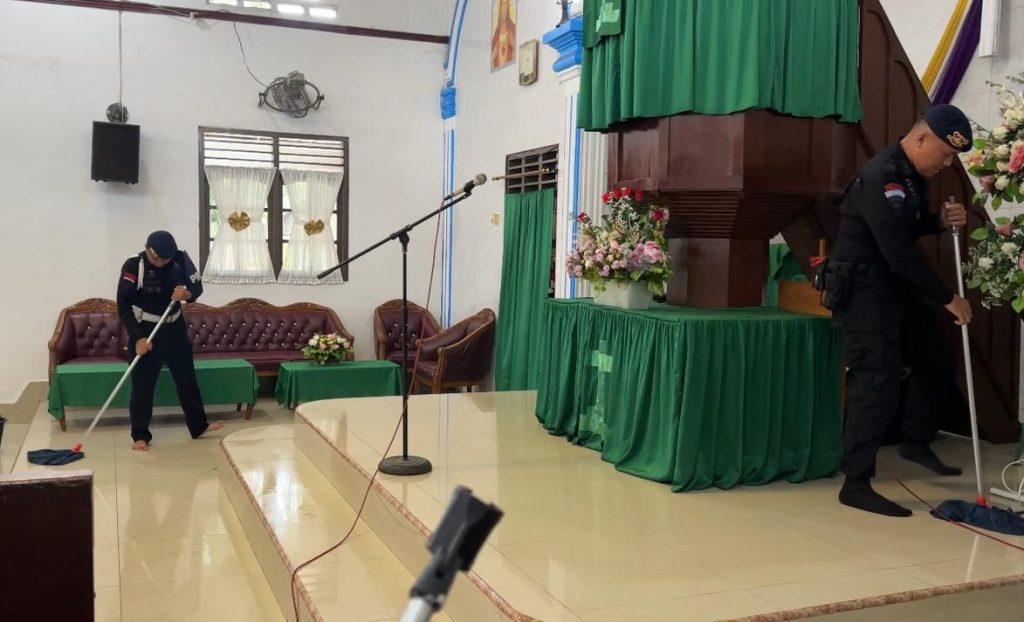 “Minggu Kasih” Brimob Polda Sumut Bersih-Bersih di Gereja HKI Resort Khusus Asuhan Stadion