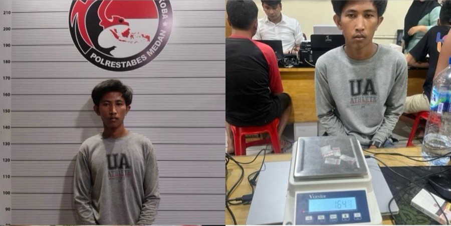 Pelaku saat diamankan Satnarkoba Polrestabes Medan. (DETEKSI.co/Ist) DETEKSI.co – Medan, Satuan Reserse Narkoba Polrestabes Medan kembali meringkus seorang pria terduga pelaku pengedar narkotika jenis sabu